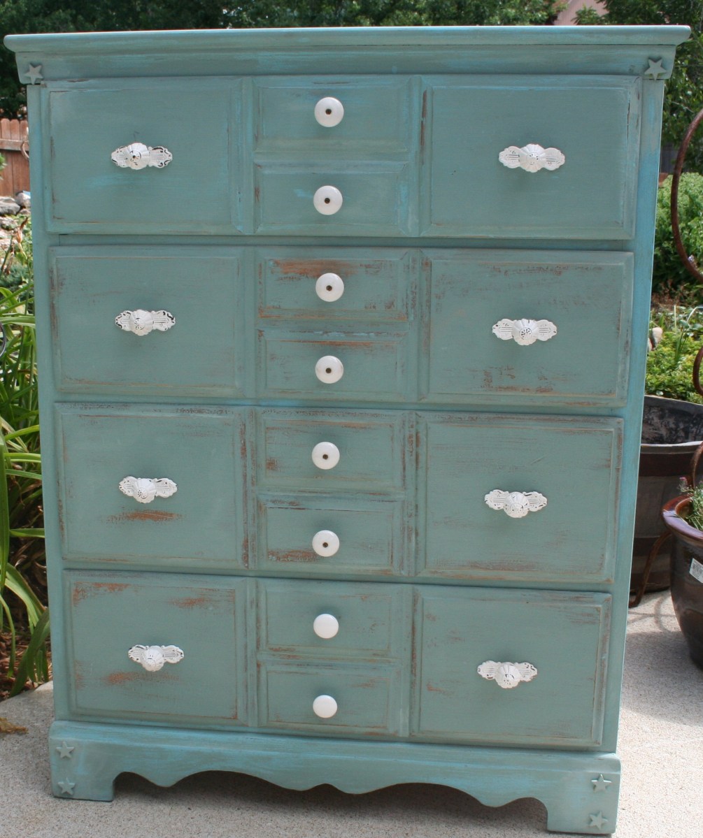 Treasure Chest 1 Published October 12, 2013 at 1852 × 2211 in Chests, Dressers, Vanities & Nightstands « Previous Next » Four-drawer chest of drawers with distressed, light-blue finish. $75.00 Like Loading...